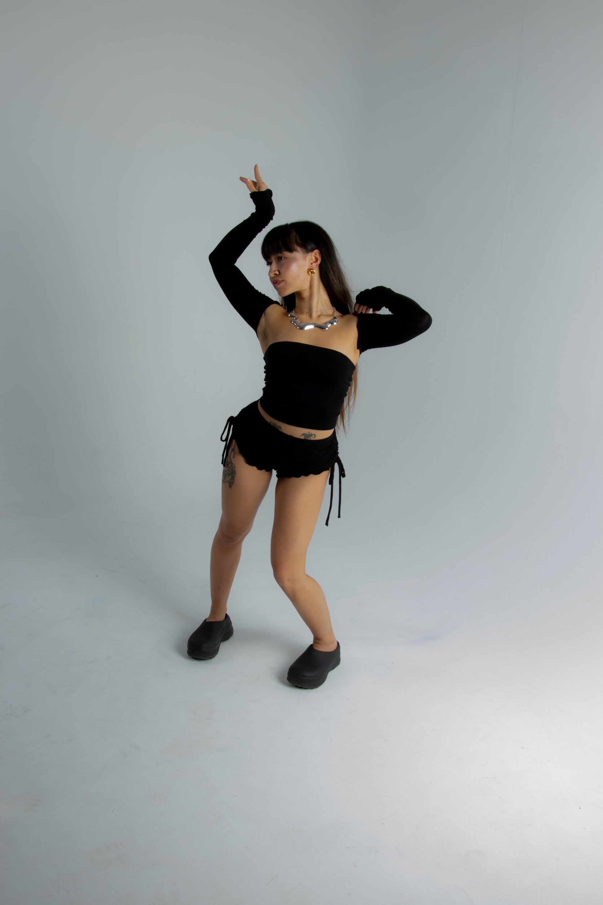 Postaw na komfort i styl! Wiskozowy top typu bandaż to must-have w garderobie każdej tancerki. Miękki, elastyczny materiał zapewnia wygodę podczas intensywnych ruchów, a bezramiączkowy krój pięknie eksponuje ramiona. Dzięki wszytej gumce top idealnie trzyma się na miejscu, nawet podczas dynamicznych choreografii. Świetnie komponuje się zarówno z szortami frill i bolerkiem– stwórz swój niepowtarzalny look!